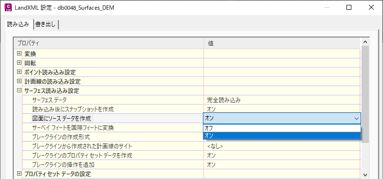 図 2: LandXML のサーフェス読み込み設定