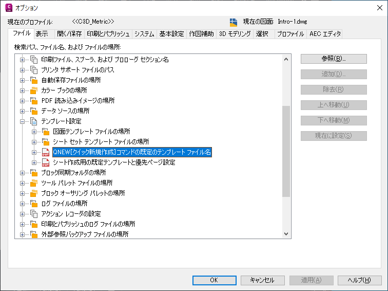 インペリアル法の縦断を使用して Autodesk Civil 3D を開始する場合、新規図面の既定のテンプレートは _Autodesk Civil 3D (Imperial) NCS.dwt です。メートル法の縦断を使用して Autodesk Civil 3D を開始する場合、新規図面の既定のテンプレートは _Autodesk Civil 3D (Metric) NCS.dwt です。既定のテンプレートは、Autodesk Civil 3D を起動したとき、または新しい図面(QNEW[クイック新規作成]コマンド)を作成したときに適用されます。各自のニーズに合わせて、別の既定テンプレートを指定することもできます。