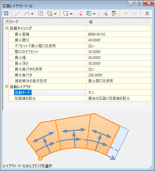 [区画レイアウト ツール]を使用して、既存の区画を自動的または半自動的に分割できます。自動モードでは、区画レイアウト ツールを使用して、使用可能な面積を占有する複数の新規区画を自動的に配置、プレビューすることができます。[自動モード]をオフにすると、レイアウト ツールによって新規の提示区画が 1 度に配置されます。