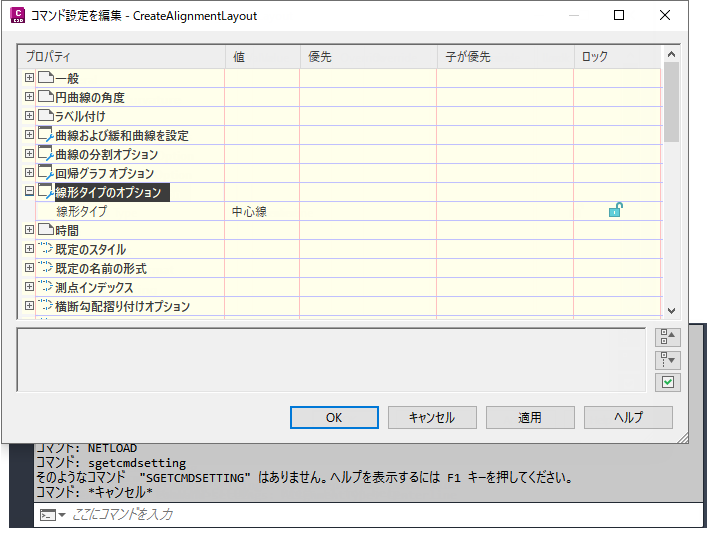 コマンド設定はコマンドに適用され、Autodesk Civil 3Dの[ツールスペース]の[設定]タブで、各項目の[コマンド]フォルダに対応します。各コマンド設定には、SettingsCmdCommandName という名前の対応するクラスがあります。たとえば、CreateAlignmentLayout コマンドに対応する設定クラスは、SettingsCmdCreateAlignmentLayout です。他の設定タイプと同じように、CivilDocument.Settings.GetSettings() メソッドを使用して、ドキュメントのコマンド設定オブジェクトにアクセスします。