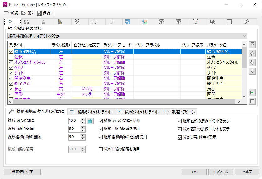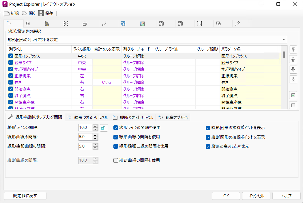- [レイアウト オプション]ダイアログ ボックスの[線形]タブで、[線形/縦断の列レイアウトを設定]が選択されていることを確認します。