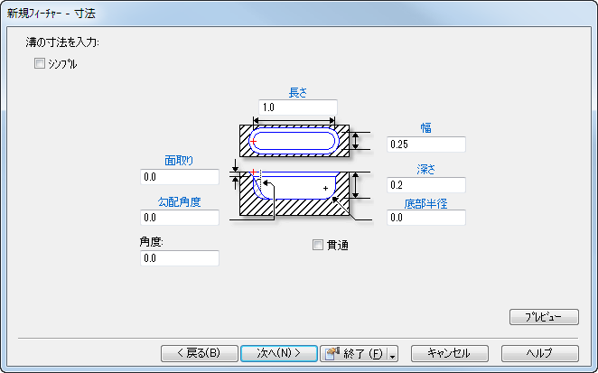- 溝 を選択して 次へ をクリックし、新規フィーチャー - 寸法 ページを表示します。
