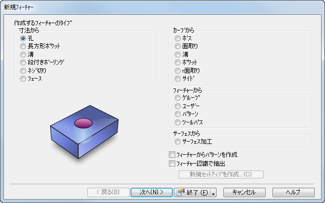 - 複数の工程がある場合、次へ をクリックすると、次の工程の 新規フィーチャー - デフォルト工具 ページが開きます。後に続く工程がない場合、次へ をクリックすると 新規フィーチャー - 要約 ページが開きます。