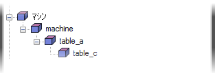 すべてのソリッドは、マシンに関連付けられていなければなりません。次の パーツ ビュー の machine ソリッドは実際のソリッドではなく、マシンのトップ レベルを表したものです。すべてのソリッドをシミュレーションに含めるには、それらを machine に関連付けなければなりません。親と子のリレーションは、パーツ ビュー の machine 以下に表示されています。ここでは、単純な「テーブル-テーブル」マシンの階層であることが分かります。