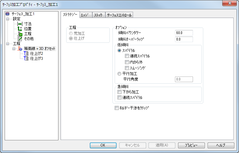 傾斜バウンダリー - 低傾斜領域と急傾斜領域とを区別するための角度です。この角度より傾斜の低いサーフェスは平行パス、傾斜の高いサーフェスは等高線パスで加工されます。
