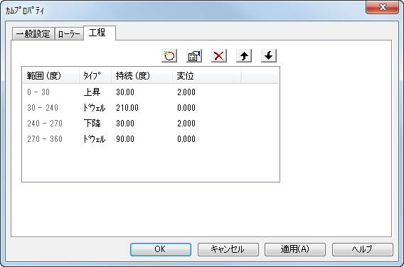 円筒カムやバレル カムの設定は、標準のカムの設定方法と同様です。往復カムの詳細については、カム を参照してください。簡易カムでは、上昇と下降は径方向の距離となります。円筒カムでは、ラップ軸に沿って上昇と下降が変位します。