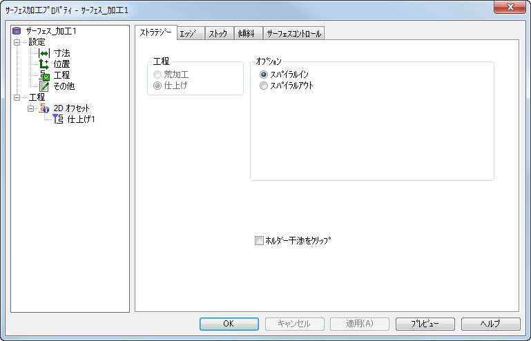 ホルダー干渉をクリップ - ホルダーやシャンクが、パーツ サーフェス、チェック サーフェス、加工されていないストックと干渉する場合、その箇所のツールパスをトリムします。選択した場合、工程の フライス加工 タブに ホルダー クリアランスシャンク クリアランス プロパティが表示されます。
