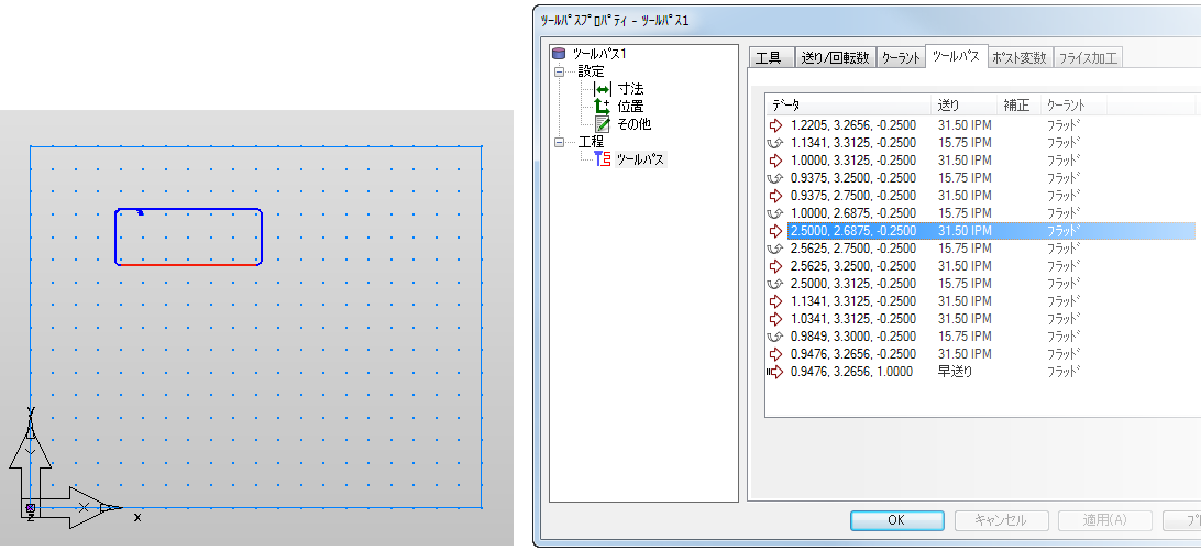 ツールパスは、一連のポイントとして表示されています。表で行を選択すると、該当の移動が赤で強調表示されます。