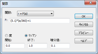 プレビュー - 確認用のカーブが表示されます。この時点で、生成された関数が図形データとして適用されることはありません。開始、終了、増分値の設定内容により、プレビューの生成に時間がかかることもあります。