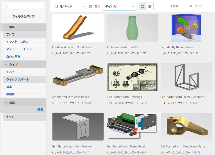 [タイプ]フィルタを[クイック スタート]に設定すると、スケッチ、パーツ モデリング、アセンブリの作成、および図面内のデザインの文書化の基本を説明するチュートリアルが表示されます。
