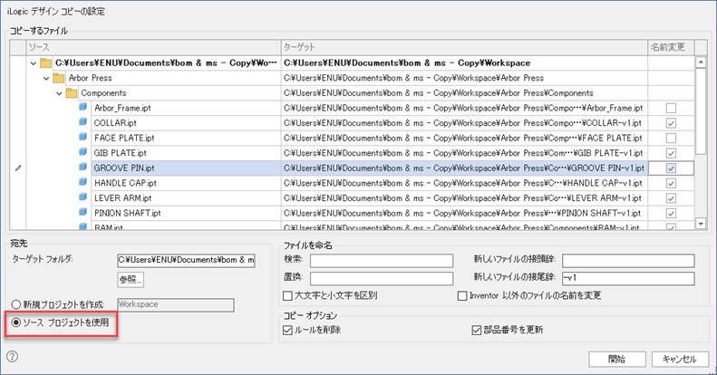 ファイルをコピーして新しいプロジェクトファイルを作成せず、ファイルを再利用できるようになりました。ターゲット フォルダがソース フォルダと同じ場合は、[iLogic デザイン コピーの設定]ダイアログの[ソース プロジェクトを使用]オプションを選択して目的の接頭辞または接尾辞を指定するか、[検索と置換]オプションを選択してファイルの名前を変更します。次に、名前を変更しない特定のファイルの[名前変更]オプションをオフにします。