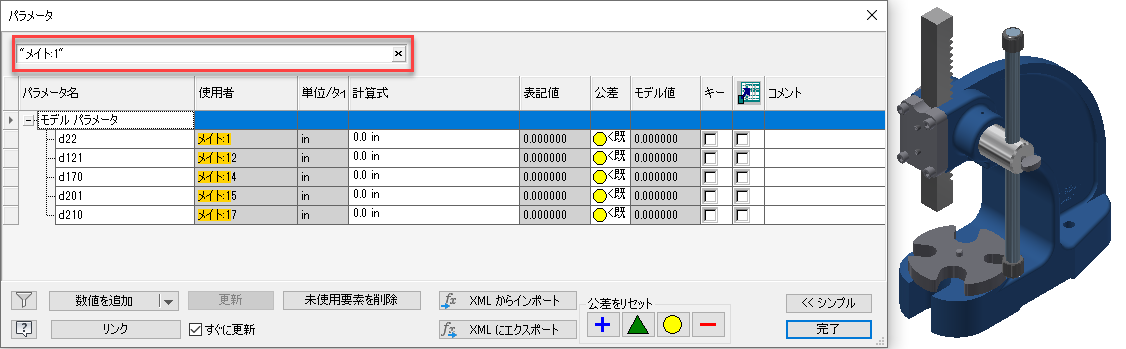 [パラメータ]ダイアログ ボックスの上部に追加された新しい検索ボックスを使用して、パラメータをすばやく検索できるようになりました。検索条件を指定するにつれて、検索結果が自動的に更新され、一致する検索がハイライト表示されます。検索はすべてのパラメータ フィールドで実行され、たとえば必要な列などで、さまざまな検索条件を組み合わせたり、必要に応じて検索を制限したりすることができます。