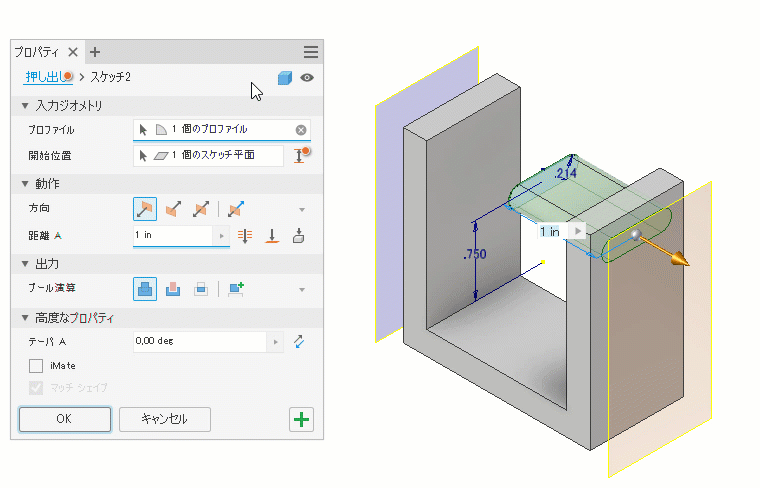 - [押し出し]などの[テーパ]パラメータがあるコマンドで[終了位置]/[次へ]/[貫通]オプションを使用する際に、プロパティ パネルのテーパ値編集フィールドをクリックすると、キャンバス内テーパ コントロールがアクティブになります。