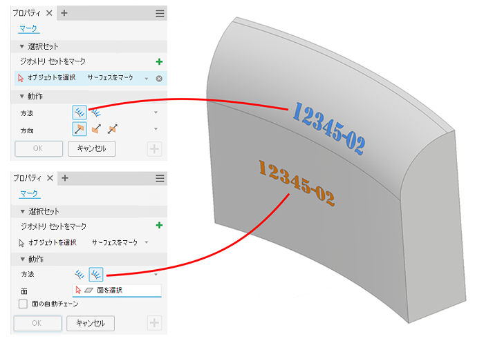 複雑な面には[投影]オプションを、単純な曲面には[ラップ]オプションを使用します。