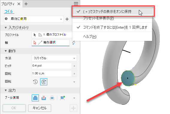 [コイル]コマンドを使用する場合、[適用]を使用してコイルを作成するときに、パスおよびプロファイル スケッチを表示したままにするオプションがあります。[コイル]プロパティ パネルの[高度な設定]メニューで、[( + )のスケッチを表示したままにする]オプションを選択します。