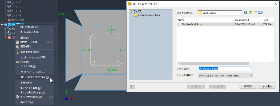 シート メタルのフラット パターンを STEP 形式で出力します。出力は単純なソリッド モデルです。フラット パターン スケッチは出力に含めることができ、エクスポート対して可視である必要があります。フラット パターンがアクティブかどうかにかかわらず、[コピーを名前を付けて保存]は使用可能です。