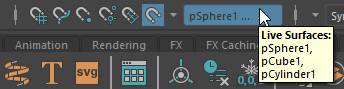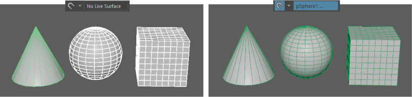 注: ライブ サーフェスは、ポリゴン メッシュ、NURBS サーフェス、GPU キャッシュ ノード、コンストラクション プレーン、またはスムーズ メッシュ プレビュー メッシュにすることができます。ライブ サーフェスにする(Make Live)は、非表示のサーフェスもサポートします。