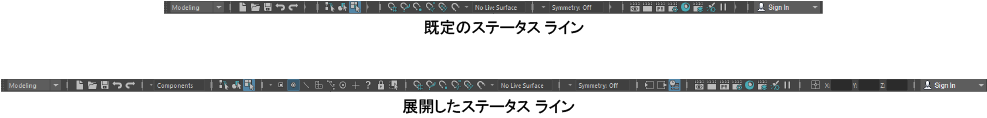 ステータス ライン(ツール バー)には、セレクション マスクを変更するためのいくつかの異なるコントロールがあります。セレクション マスクによって、どのタイプのオブジェクトまたはコンポーネントを選択できるようにするかを定義します。