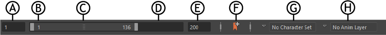 A.アニメーション開始時間 B.再生開始時間 C.レンジ スライダ バー D.再生終了時間 E.アニメーション終了時間 F.タイム スライダのブックマーク(Time Slider Bookmark)アイコン G.キャラクタ セット(Character Set)メニュー H.アニメーション レイヤ(Animation Layer)メニュー