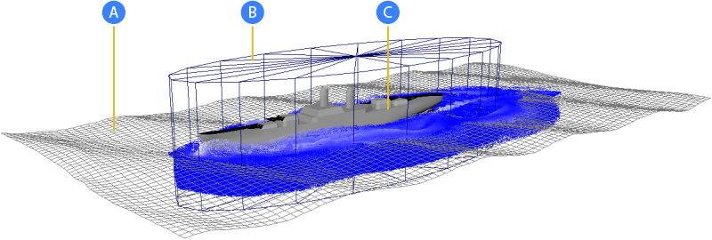 一般的なワークフローでは、メッシュを使用して液体サーフェスのシミュレートされていない領域をレンダリングしてから、シミュレートされたレンダリングとシミュレートされていないレンダリングを合成中にブレンドすることもできます。