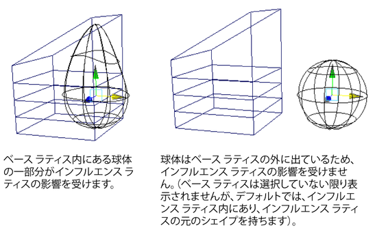 ラティス デフォーマのデフォメーション エフェクトは、通常、変形するオブジェクトがベース ラティス(既定の名称は ffdnBase)内にあるかどうかによって左右されます。オブジェクトが完全にベース ラティスの外にある場合、デフォメーション エフェクトは生じません。なぜなら、ラティス デフォーマでは、エフェクトの計算がベース ラティス、インフルエンス ラティス、ベース ラティス内のオブジェクトの位置といった空間的なリレーションシップに基づいて行われるからです。オブジェクトがベース ラティスの外にある場合、Maya はエフェクトを計算することができません。同様に、オブジェクトの一部分だけがベース ラティス内にある場合は、ベース ラティス内にあるコンポーネント(CV など)だけがインフルエンス ラティスの影響を受けます。