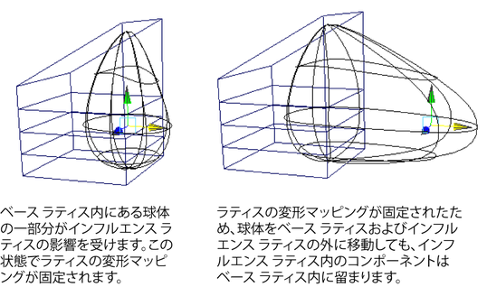 ラティスの変形マッピングを固定すると、インフルエンス ラティスとその内部にあるすべてのコンポーネントのリレーションシップが固定されます。固定時にインフルエンス ラティス内にあったオブジェクト コンポーネント(CV など)はラティス内に固定され、インフルエンス ラティスに変更があった場合のみに影響を受けます。ベース ラティスを移動してコンポーネントをベース ラティス内に留めないようにしても、コンポーネント自体はインフルエンス ラティスのインフルエンス下にとどまり続けます。ただし、インフルエンス ラティスの外にあるコンポーネントは、オブジェクトと共に移動し、オブジェクトはデフォメーション エフェクトを受けます。