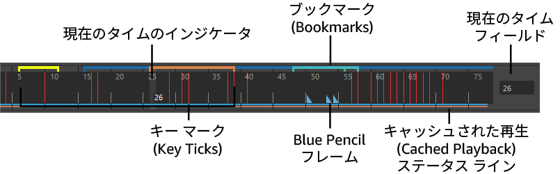 タイム スライダ(Time Slider)上の青とピンクのストライプはキャッシュされた再生(Cached Playback)ステータス ラインを示す