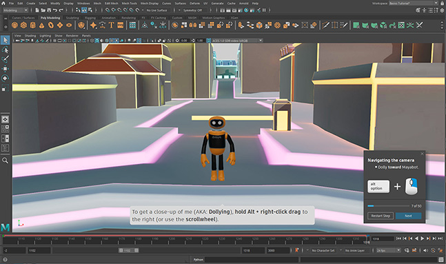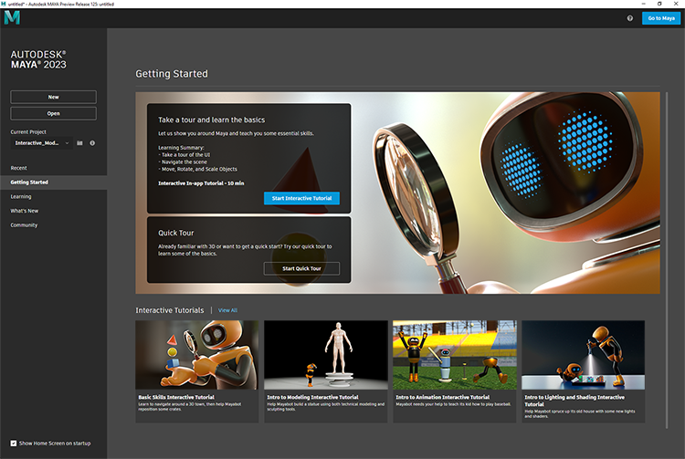 インタラクティブ チュートリアルセクションには、モデリング、アニメーション、ライティングとシェーディングの概要を説明するインタラクティブ チュートリアルが追加されています。いずれかのタイルをクリックして、それぞれのチュートリアルを開始します。