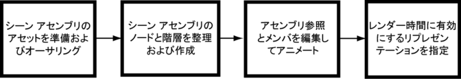 使用するプロダクション アセットを決定した後、アセンブリ定義とアセンブリ リファレンスを使用してシーンをアセンブルする方法を計画する必要があります。アセンブリ リファレンス階層の使用方法について明確なアイデアがあると、シーン アセンブリの使用がはるかに簡単になります。アセンブリ リファレンスおよび定義を効率的に使用する方法を決定することができます。
