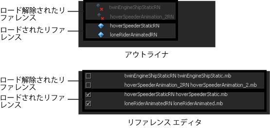 アウトライナ(Outliner)またはリファレンス エディタ(Reference Editor)からは、リファレンスのロードとアンロードを行うことができます。ファイル リファレンスのロードとアンロードを参照してください。