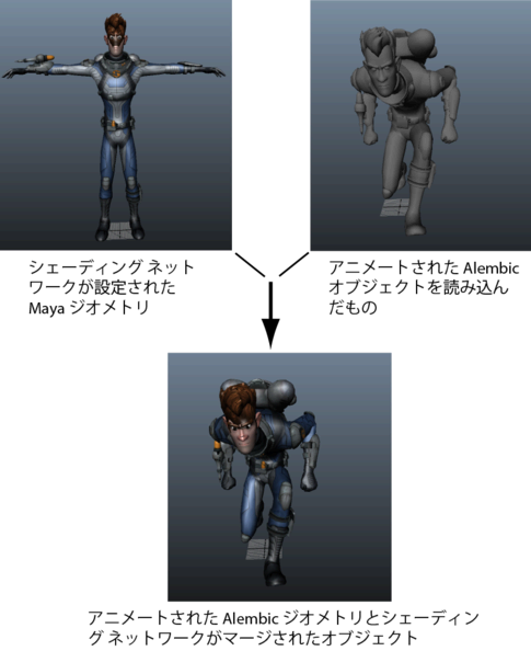 Alembic キャッシュを読み込むときに、キャッシュされたオブジェクトをオリジナルの Maya オブジェクトとマージすることができます。マージされると、シーン内のオリジナルのオブジェクトが Alembic ジオメトリに置き換えられます。Alembic オブジェクトのアニメーション データは保存され、シーン オブジェクトからシェーディング データを継承します。マージするには、Alembic オブジェクトの名前とオブジェクト階層がソース ジオメトリと同じである必要があります。シーンと Alembic オブジェクトのトポロジは、一致する必要はありません。
