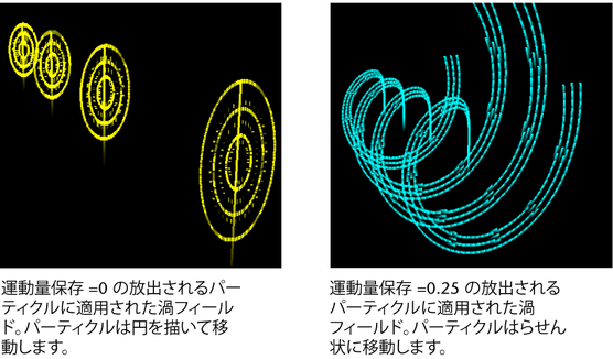 渦フィールドをパーティクル オブジェクトに対して使用する場合、パーティクル オブジェクトの運動量保存(Conserve)アトリビュートを設定して、モーションにインフルエンスを与えることができます。運動量保存(Conserve)を 0 に設定した場合、パーティクル オブジェクトのモーションは円状になります。運動量保存(Conserve)を 0 よりも大きい値に設定すると、らせん状のモーションが得られます。