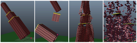 複合の例: 1000 個のレンガで作られた、リジッド ボディ ソルバの塔があります。最初の塔は複合オブジェクトです。2 番目の塔には複合オブジェクトとして設定された 3 本の柱のそれぞれがあります。最後の 2 つのイメージでは、ハルおよび立方体タイプのオブジェクトに設定された個別のレンガ セットを示しています。