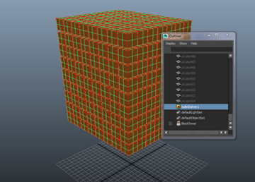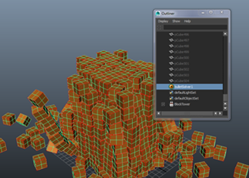 ソルバ処理で数多くのオブジェクトに依存するシミュレーション(たとえば何千ものレンガで造った壁など)で作業するときは、シミュレーションのパフォーマンスに大きな影響を与える可能性があります。さらに、アウトライナ(Outliner)の中のオブジェクトを 1 つ 1 つ選択するのは手間がかかります。このようなケースでは、ソルバ処理に含まれるリジッド ボディ オブジェクトのみで構成されるリジッド セットを作成するのが最善です。