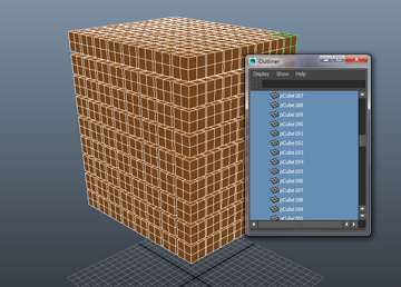 また、Alembic キャッシュを使用して、メッシュのシェイプを書き出すこともできます。この方法では、手動でマテリアルやシェーダを再接続する必要はありますが、オブジェクトが 50,000 もあるシーンを 1 つの大きなメッシュに削減できます。詳細については、「Alembic を使用して Bullet シミュレーションをレンダリングする」を参照してください。