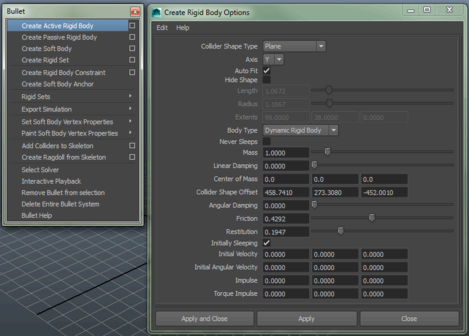 アクティブ リジッド ボディの作成(Create Active Rigid Body)が選択されているときにメッシュが選択されている場合は、メッシュの凸型ハルを既定のコライダとして使用してリジッド ボディがメッシュに関連付けられています。メッシュが選択されていない場合、ボックスを既定のコライダ シェイプとして使用してリジッド ボディが作成されます。リジッド ボディのタイプは、bulletRigidBodyShape ノードのアトリビュート エディタ(Attribute Editor)のリジッド ボディのプロパティ(Rigid Body Properties)セクションでボディ タイプ(Body Type)アトリビュートを編集することで、変更することができます。また、新しいリジッド ボディを作成するときに使用される既定の設定も変更できます。変更は、Bullet メニュー エントリの右にあるオプション ボックスをクリックします。