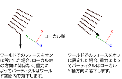 オブジェクトを回転させない限り、パーティクル オブジェクトのローカル軸の方向とワールド空間の軸の方向は一致することに注意してください。