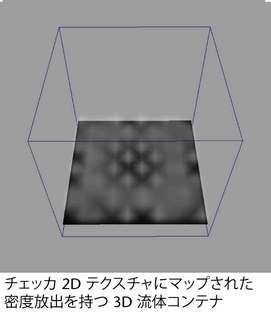 サーフェス エミッタを使用する場合、サーフェス オブジェクトの UV テクスチャ座標を使用して、流体の放出がマップされます。ボリューム エミッタを使用する場合、ボリュームのシェイプに一致する UV 投影を使用して、流体の放出がマップされます。たとえば、立方体(Cube)ボリュームは平面投影でマップし、球(Sphere)ボリュームは球面投影でマップします。密度(Density)、熱(Heat)、燃料(Fuel)の放出値は、テクスチャ値と掛け合わせられます。