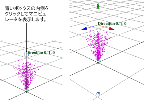 青いボックスの内側をクリックします。移動(Move)ツールと同じ形のマニピュレータが表示されます。中心部分を任意の方向へドラッグするか、移動マニピュレータを使用していずれかの矢印をドラッグします。このマニピュレータは、ディレクショナル ポイント エミッタの場合にのみ表示されます。