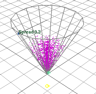 放出方向に対してほぼ垂直にドット アイコンをドラッグします。これによって、スプレッド角度を表す円錐が表示されます。ドットをドラッグする場合、ドラッグ可能な方向を示すラインがワークスペースに表示されます。