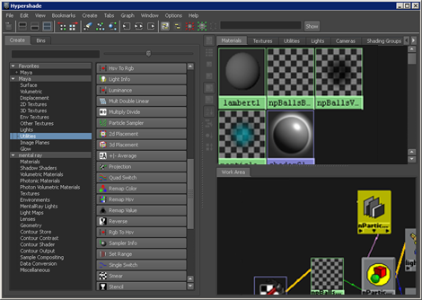 どのパーティクル サンプラ(Particle Sampler Info)ノードがどのシェーダに付属するのかわからないときには、シェーダを選択し、グラフ(Graph)| アップ(Up)と下流接続(Downstream Connections)を使用して、関連付けられたユーティリティ(Utility)ノードを表示します。