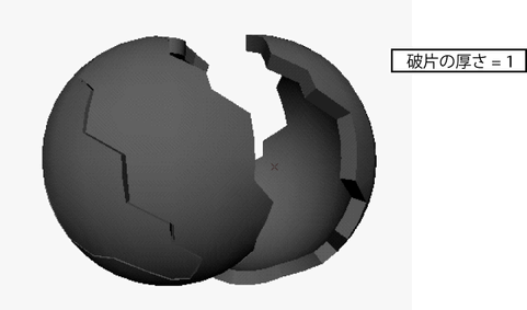 サーフェス粉砕(Surface Shatter)エフェクトおよびクラック粉砕(Crack Shatter)エフェクトに適用されます。破片の厚さを指定します。正の値を指定すると、サーフェスが外側に押し出されて厚みが作成され、負の値を指定すると、サーフェスが内側に押し込まれます。粉砕エフェクトを作成した後で、このアトリビュート値を変更することができます(破片のエクストルージョン値を変更するを参照)。