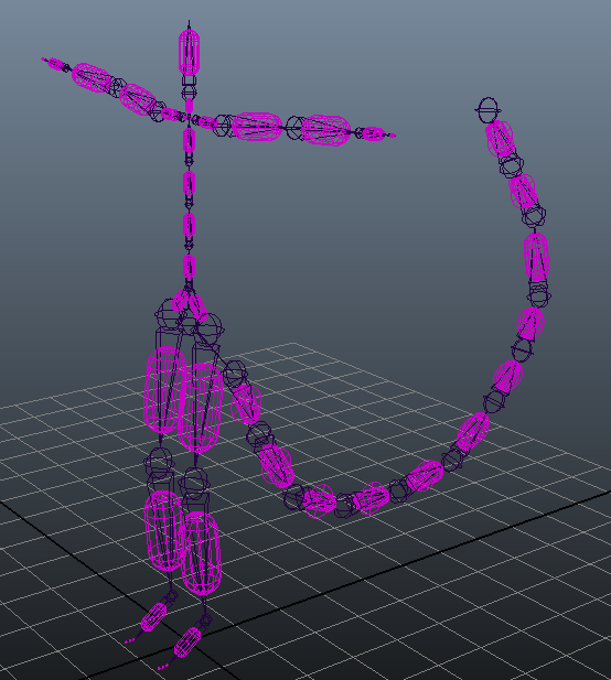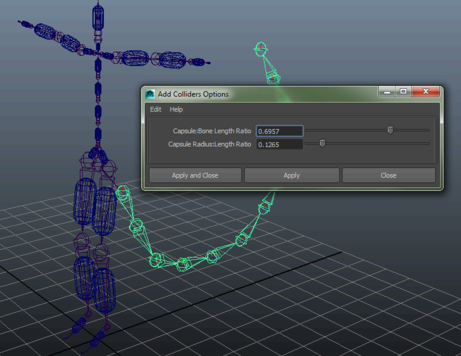このツールは、現在選択されているジョイントから順にジョイント階層を調べ、各ボーンにカプセルを作成します。これらのカプセルはスケルトンのアニメーションに従い、ダイナミック Bullet オブジェクトと衝突します。
