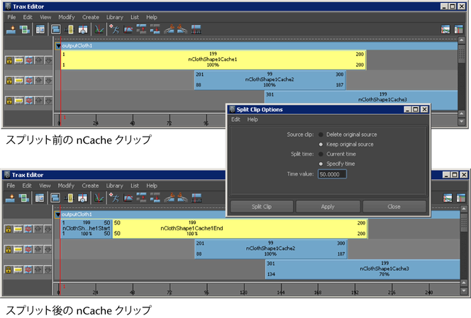 nCache クリップは、クリップの分割オプション(Split Clip Options)ウィンドウの現在の設定に従って分割され、選択したキャッシュ クリップの代わりに 2 つのクリップが表示されます。Trax エディタ(Trax Editor)の編集(Edit)メニューで分割(Split)を参照してください。