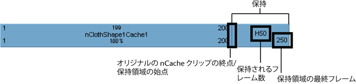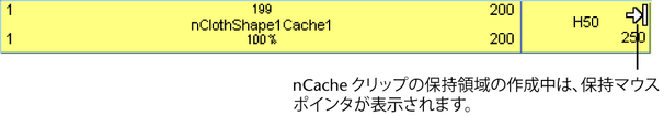 保持領域は nCache クリップの一部または延長で、最後にシミュレートした状態が指定した時間だけ保持されます。保持領域は「H」で示されます。