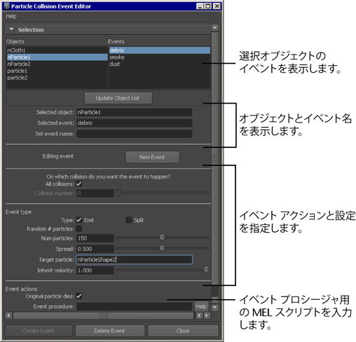 また、MEL プロシージャを使用してパーティクル衝突イベントを作成することもできます。詳細については、衝突イベントの MEL プロシージャを作成するを参照してください。
