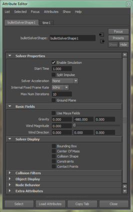 bulletSolverShape ノードが作成されます。このノードのアトリビュートは、重力と風のようなシーン全体に適用される Bullet Physics の全体設定、および使用されているソルバ エンジン(OpenCL CPU や OpenCL GPU)を管理します。