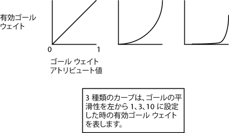 ゴールの平滑性(Goal Smoothness)が 1 の場合、ゴール ウェイトが 0 から 1 に少しずつ増加するに従って、ゴール ウェイト エフェクトが均等に増加します。ゴールの平滑性(Goal Smoothness)の値が 1 よりも大きい場合、ゴール ウェイトの値が 0 から増加するに従ってエフェクトがゆっくりと拡大し、1 に近づくと急速に拡大します。オブジェクトの既定のゴールの平滑性(Goal Smoothness)は 3 です。