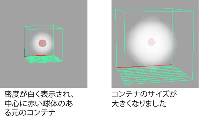 たとえば、密度(Density)が設定されたコンテナのスケールを大きくすると、密度は前より薄く表示されます。これは、大きくなったボクセルのサイズに合わせて各ボクセルの密度が再配分されるためです。