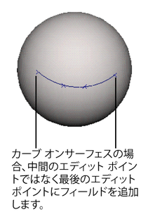 フィールドは、パーティクル オブジェクトの一部のパーティクルだけでなく、すべてに追加することができます。カーブ オンサーフェスの場合、カーブ全体または(特定の CV ではなく)特定のエディット ポイントにフィールドを追加することができます。エディット ポイントを使用している場合、最良の結果を得るためには最後のエディット ポイントにのみフィールドを追加します。